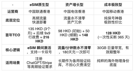 在构建“一人公司”的自动化工作流时,很多架构师会卡在最基础的物理层:海外验证码接收、支付网关实名、以及 AI 原生工具的地域限制。一张稳定、可低成本保号的海外 SIM 卡,不是生活用品,而是你全球化数字资产的“身份令牌 (Token)”。本期,我深度拆解并对比了香港三家运营商的底层资费与架构逻辑。